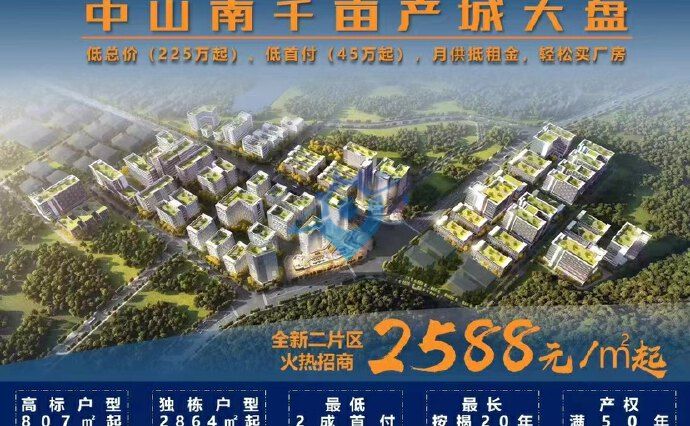 中山南千亩科创城 一期盛大交付 二期交付在即 三期火热招商 中山规模最大千亩园区 中山价格最低:2588元起 产品类型最多: 独门独院,买4层用7层 标准厂房,多种层高可选