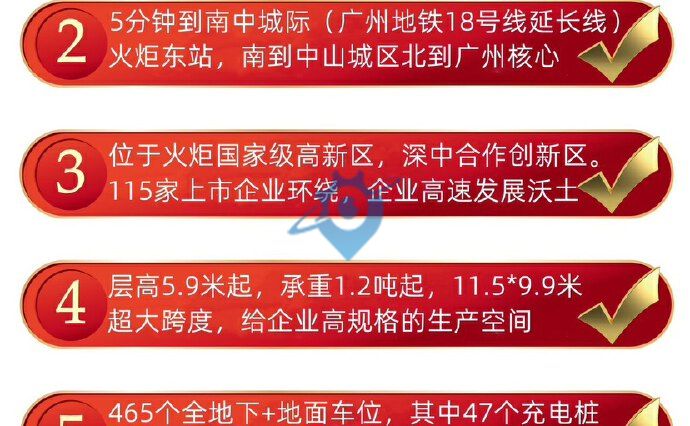 火炬区/4字头/6米高/现房 中山最好的区位,位于国家重点建设的火炬高新区 区域内性价比最高 5分钟到深中通道第二出口,30分钟到深圳 5分钟到在建中的南中城际火炬东站(广州18号地铁线延长线) 占地面积:118亩,超大园区 建筑面积:约30万㎡ 土地性质:M2 户型面积:1577-2895㎡,承重1.2吨起,6米高起(一字型,H型楼布局) 高配车位:全地下+地面共465个车位,其中47个充电桩车位,项目品质高 园区配套与规划:高端公寓+食堂+商超。 打造集生产、研发、办公、展厅一体的的花园式产业空间,为进驻企业塑造高端的企业总部形象。