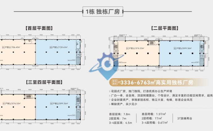 项目规模:总占地面积约206亩,总建筑面积约50万㎡ ?一期规模:占地面积约82亩,建筑面积约20万㎡ ?园区规划:一期规划独栋厂房8栋、高标厂房4栋;配备充足的员工公寓、食堂、停车位; ?收楼时间:2025年底 ?1-4栋【独栋厂房】建面约3336-6763㎡ 配备3T货梯2台 首层:层高7.8m、荷载1.5T/㎡ 2层:层高7m、荷载1.0T/㎡ 3至4层:层高4.5m、荷载0.6T/㎡ ?花园式厂房,独门独院,打造绿色生态办公生产环境; ?厂办一体,全自用,顶层附赠露台,个性设计,满足丰富的功能空间需求,超高使用率; ?企业封面资产,享独家冠名权、独立大堂、电梯、员工会所等,彰显风范; ?片区内稀缺产品,买少见少: ?5栋 【高标厂房】 建面约882-1137㎡ 配备5T货梯2台、3T货梯2台、1.6T消防/客梯2台 首层:层高7.9m、荷载1.5T/㎡ 2层至5层:层高5.2m、荷载1.0T/㎡ 6层至9层:层高5.2m、荷载0.8T/㎡ ?约5.2-7.9米百变灵动层高 满足研发、生产、检测、办公等多种需求; ?一字型设计,一层两户,自由组合,长度可达70米,满足多种生产设备需求 ?配备吊装口,地面预留吊装场地,解决大尺寸、大重量货物运转问题; ?组合配置4部3-5T载重货梯,2部客梯兼消防梯,保证日常客货高效运转; ?0.8-1.5T/㎡高荷载厂房,满足不同产业形态,轻松实现“工业上楼”;