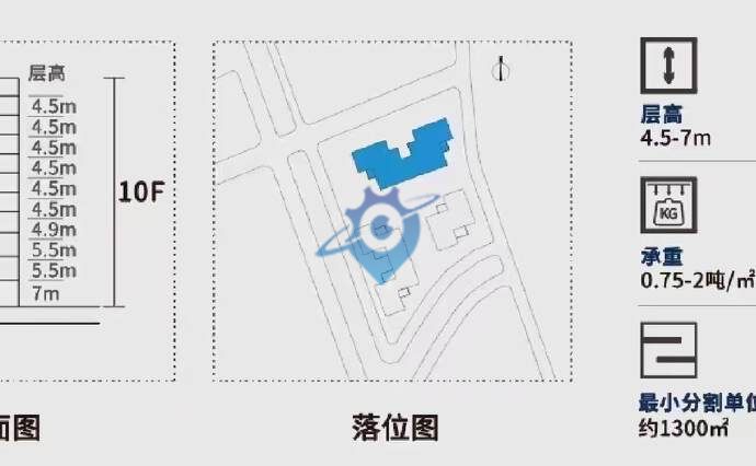 【厂房参数】 总层数:10层 标准层面积:约1300-5200㎡,1300㎡起售; 楼层高度:首层7米;2-3层5.5米;4层4.9米;5-10层4.5米; 楼层承重:首层实地单位荷载无上限,镂空单位荷载2T/㎡;2-4层荷载1T/㎡; 5-10层荷载0.75T/㎡;充分满足重型制造类企业承重需求。 电梯配置:每栋货梯1部5T、2部3T、每栋客梯2部,客货分流、人车分流; 厂房柱网:大跨距设计 - 柱距8.8x8.6米 配电总量:10000kw, 停车位配置:362个顶配停车位 (291个地下+71个地面,配备新能源充电桩) 生产配套 :园区设有称重和吊装,满足企业生产及发货需求。